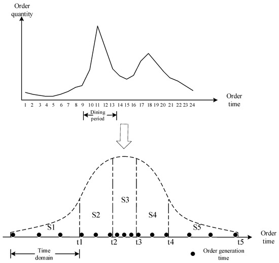 During the actual delivery process, the demand for takeout orders exhibits real-time characteristics. The planned path must be adjusted in real time to accommodate dynamic changes in demand when new orders are generated. To incorporate the temporal distribution of takeout orders from the “China Takeout Industry Survey Report” and reduce the complexity of solving dynamic problems in real time, the RHC strategy is adopted [23]. According to the normal distribution of orders placed during the dining period, the system time is divided into equal-area time domains by definite integral, as shown in Figure 3. The newly generated orders are sequentially collected and re-planned at the end of each time domain according to their chronological order. The dynamic takeout delivery vehicle routing problem is transformed into a static one through the integration of new orders into the existing path.