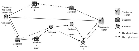 For example, the newly generated takeout order information and the node information of the takeout delivery vehicle currently located or about to arrive are collected at the end of the time domain. The time, distance, and load weight of the takeout delivery vehicle are calculated. The served node is deleted, and the takeout delivery vehicle’s current node location is the first access node to re-plan the takeout delivery path. The specific process is shown in Figure 4.