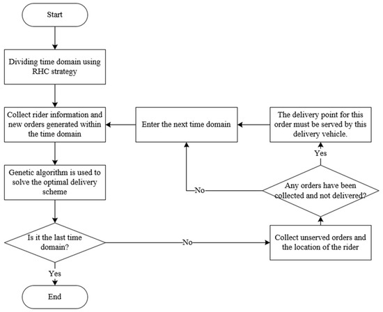The system time is divided into multiple time domains. The new orders and rider information generated within the time domain are collected along with the unfinished service orders in the previous time domain, and the genetic algorithm is used to re-plan the delivery vehicle paths for takeout. At the end of the time domain, the unserved orders and the location of the rider are collected as the objects to be optimized and the first service point in the next time domain. Simultaneously, it is ascertained if there are any orders that have been collected but not yet delivered. If not, the next time domain is entered directly. Otherwise, the delivery point of the order must be served by the rider at the pick-up point during the optimization in the next time domain. When the last time domain route solving is complete, the dynamic solving of the takeout delivery vehicle routing problem is complete.