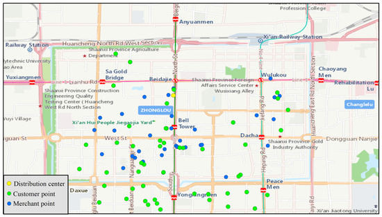 Taking Xi’an Bell Tower as the center and radiating 2 km to the surroundings, 50 real residential communities and 40 takeout businesses within the scope are selected as customers and merchants for the takeout orders, respectively. Their distribution is shown in Figure 10. The simulation research on takeout delivery of 50 orders within one hour during the lunch period is conducted. The order time followed a normal distribution, the food weight range of the order is 500 to 1000, the food value range is 15 to 30, the preparation time range of food is 300 to 600 after the customer places the order, the estimated delivery window for the order is 1200 to 2100 after the order is placed, and the service time range of the rider to customers and merchants is 45 to 60. Part of the takeout order information is shown in Table 5.