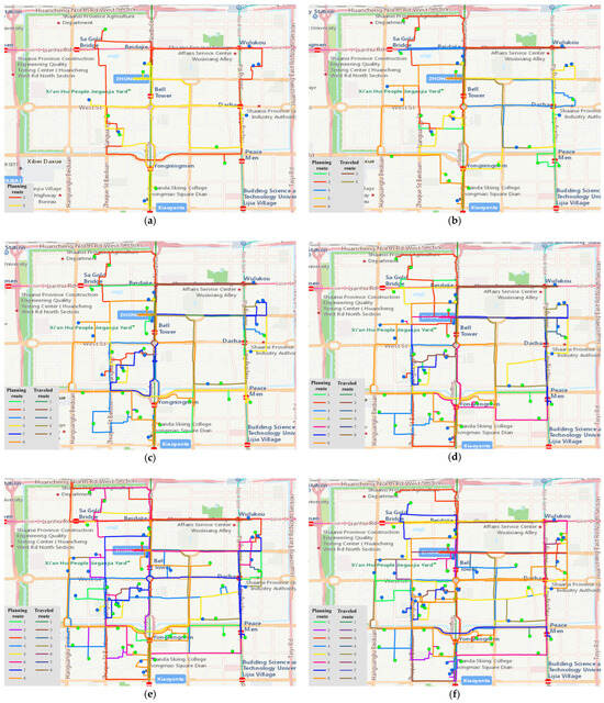 Optimal driving route of takeout delivery vehicles in different time domains. (a) Takeout delivery route in the first time domain. (b) Takeout delivery route in the second time domain. (c) Takeout delivery route in the third time domain. (d) Takeout delivery route in the fourth time domain. (e) Takeout delivery route in the fifth time domain. (f) Takeout delivery route in the sixth time domain.