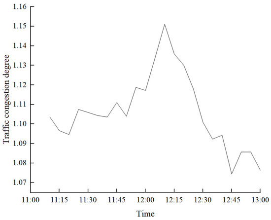 To assess the temporal variation in driving speeds of delivery vehicles, through the traffic API of Baidu Map (Beijing Baidu Netcom Science Technology Co., Ltd., Beijing, China), we collected data on traffic congestion levels along the main routes (including secondary roads and branches) used by electric bikes within the geographical area covered by our sample of delivery orders during the lunch hour over a period of 14 days. The traffic congestion levels were converted into real-time driving speeds of delivery vehicles according to Table 2 and Equations (1) and (2). The corresponding traffic congestion levels for part of roads during various time periods are presented in Table 6 and Table 7.