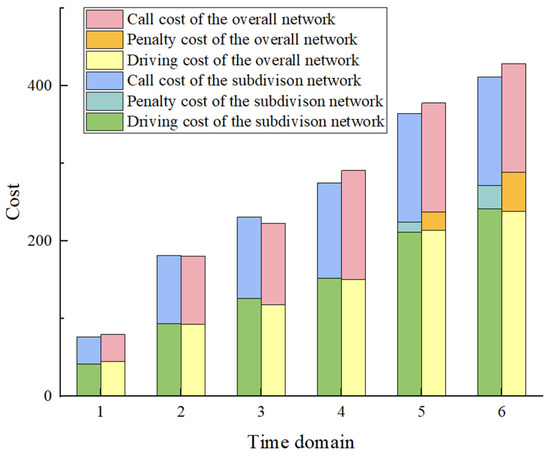 As shown in Figure 13, from time domains 1 to 6, the total number of orders also increases, which requires more delivery vehicles to be called. In order to complete the delivery, the cost of driving also increases. Due to the impact of traffic congestion, the number of orders that cannot be delivered within the expected delivery time increases, further increasing the penalty cost. In time domain 3, with the increase in congestion, the delivery vehicles considering the time-varying subdivision road network will choose the slightly longer route but the road with good congestion, so the total cost of distribution will be temporarily high. But the total cost decreases when considering the subdivision road network compared with the overall road network when all orders are delivered. Although the driving cost increases slightly, the delivery penalty cost decreases significantly, by 39%, as shown in Table 15. From the analysis of the cost structure under different time domain stages, it can be found that the road congestion is smooth in the initial stage of the time domain, and the difference in total cost under the overall road network and the subdivision road network is not significant. However, in the subsequent time domains, with the increase in road congestion and order demand, under the overall road network, the vehicles still choose the shortest route for delivery, whereas in the subdivided road network, vehicles will choose smooth roads according to the traffic congestion status of different roads even though the driving distance is slightly increased, resulting in higher driving costs than in the overall road network. This ensures that orders can be delivered within the time window, reduces the delivery penalty cost, and ultimately makes the total cost under the subdivision road network less than that under the overall road network. Therefore, considering time-varying subdivision road network can reduce total costs, ensure more orders can be delivered in a timely manner, and improve customers’ dining experience.