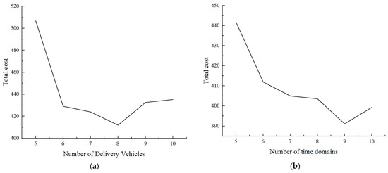 Total cost under different conditions. (a) Total cost under different numbers of delivery vehicles. (b) Total cost under different numbers of time domains.