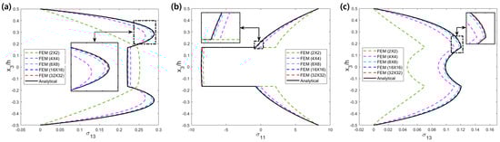 Figure 2 shows that an FE model with a 16 16 mesh density or higher can yield precise numerical solutions for predicting the local distributions of in-plane and transverse shear stresses. In particular, it can be observed that the FE solutions with a 32 32 mesh density can closely approximate the analytical solutions, even for transverse shear stresses that require third-order derivatives. This means that the FE model with a 32 × 32 mesh density can be reasonably applied in thermomechanical analysis of laminated composite and sandwich structures with arbitrary geometry, loading, and boundary conditions.
