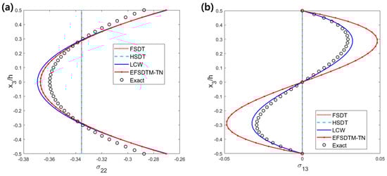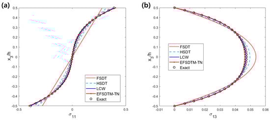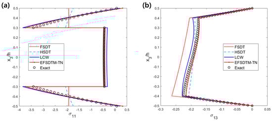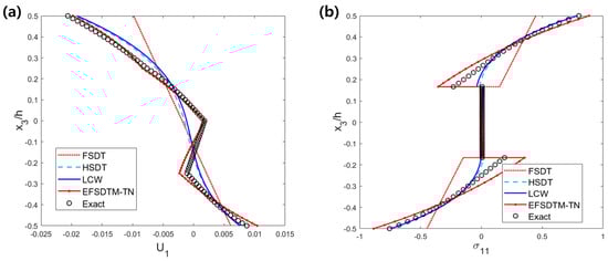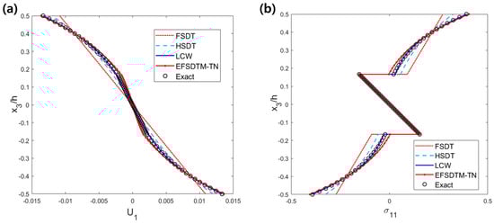 Figure 3 shows the mechanical solutions of the in-plane displacements and stresses for cross-ply laminated composite plates. From Figure 3a, it can be seen that the EFSDTM_TN precisely describes the unsymmetrical zigzag distribution of the in-plane displacement in laminated composite plates. As shown in Figure 3b, EFSDTM_TN can provide a reliable local solution for the in-plane stress by capturing its noncontinuous distribution. However, other theories are only useful for predicting the global behavior of in-plane displacement.