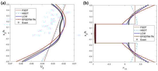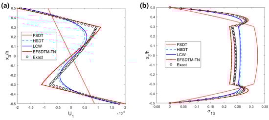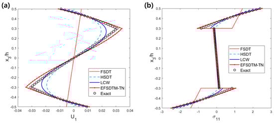 For the sandwich plate, the distributions of the in-plane displacements and transverse shear stresses are shown in Figure 4. In terms of the in-plane displacement (Figure 4a), it should be noted that EFSDTM_TN can provide a sufficiently reliable solution for the in-plane displacement, even for a sandwich plate. In addition, as shown in Figure 4b, the severe kink distribution of the transverse shear stress is completely captured by EFSDTM_TN.