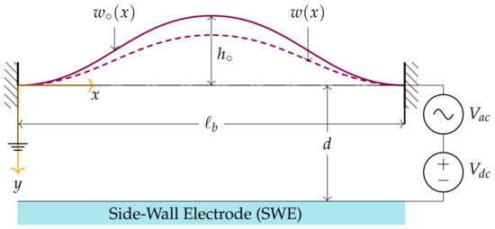 We next present an analytical model for the electrostatic initially curved microresonator, shown in Figure 1, using Euler–Bernoulli beam theory. The primary limitations of the Euler–Bernoulli beam theory encompass the presumptions of small deflections, linear elasticity, and uniform cross-sectional properties. The curved microbeam has the following dimensions: