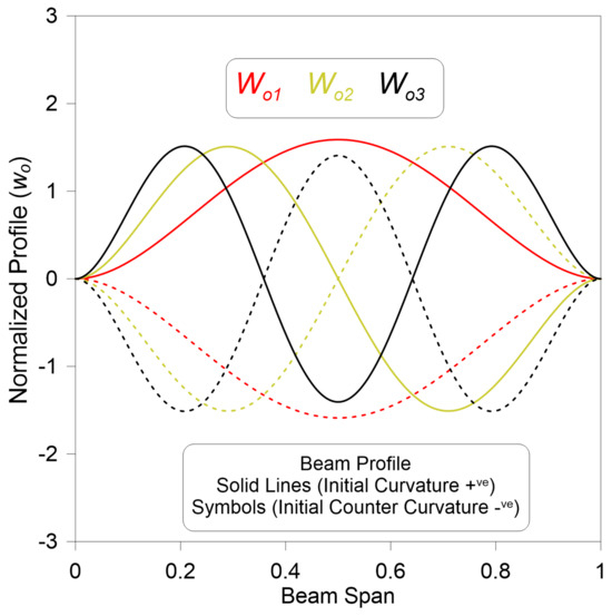 These initial curvature profiles and the initial counter-curvature profiles of the beam are illustrated as solid and dashed lines, respectively, in the following Figure 2.