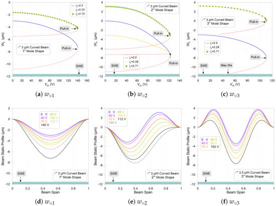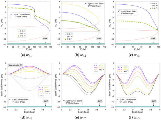 Figure 6 and Figure 7d–f display the static profiles of the shallow arch with curved-up curvature excited by various dc voltages. They are describing consistent symmetry without notable options of symmetry-breaking behavior. This means that the beam maintains its symmetric (first and third) and asymmetric (second) shapes.