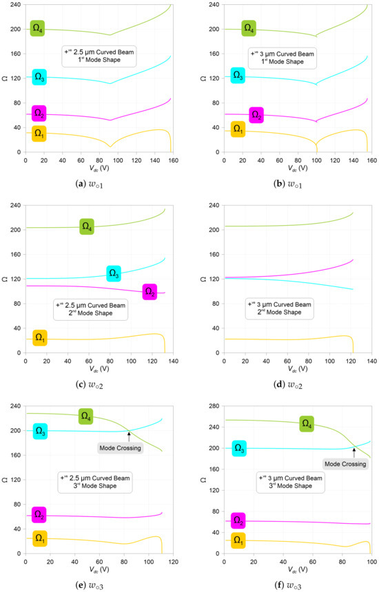 We note that the third frequency is lower than the second frequency as the beam curvature follows the second mode profile . These two values are moving away from each other as the dc voltage increases, as shown in Figure 9d. This is a classical behavior of veering phenomenon. On the other hand, a mode-crossing phenomenon is observed between the third and fourth frequencies when the shallow arch initial profile transitions to the third mode like shape, as depicted in Figure 9d.