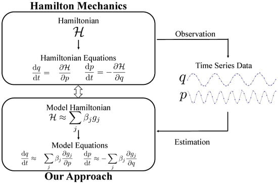 Hamiltonian mechanics offers a framework for describing the time evolution of states of physical systems that admit the law of conservation of energy. In Hamiltonian mechanics, governing dynamics is mathematically formulated by two independent variables: generalized coordinates and generalized momenta , where n is the system’s degree of freedom. Using these variables, the system’s dynamical behavior is described by the following equations: