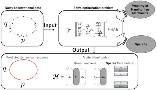 The remainder of this article is organized as follows. In Section 2, we propose a sparse model based on Hamiltonian dynamical systems. For illustration, we also describe the techniques underlying the proposed method: Hamiltonian dynamics and sparse estimation of conventional dynamical systems. Next, the proposed method is described in detail. In Section 3, we present the results of a comparison of the proposed method with two conventional methods that are unconstrained by physical laws to validate our method. First, we compare the estimation results for two systems: the Duffing oscillator and Rayleigh–Bénard convection. Second, we verify the robustness of our method against noise. Concluding remarks are given in Section 4, where the effectiveness of the proposed method is discussed and perspectives for future work are given.