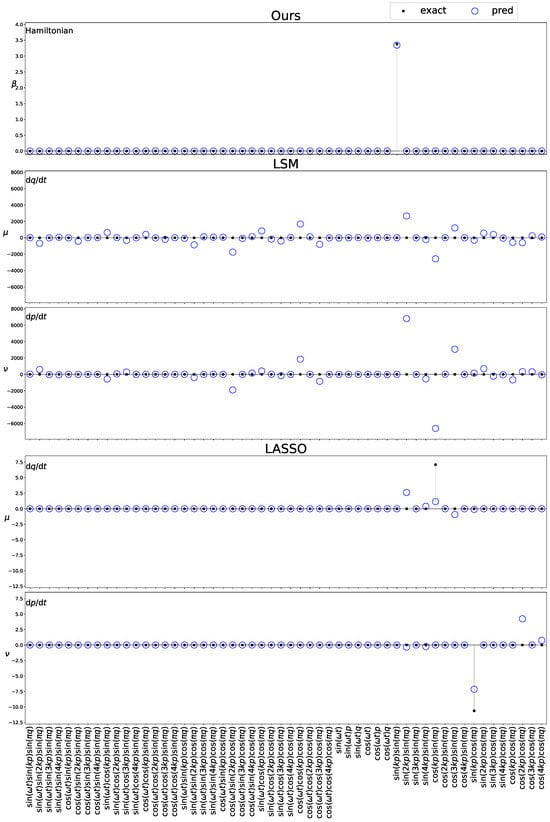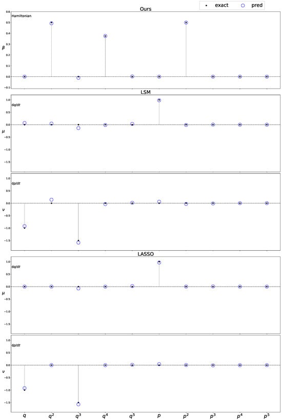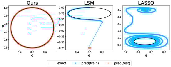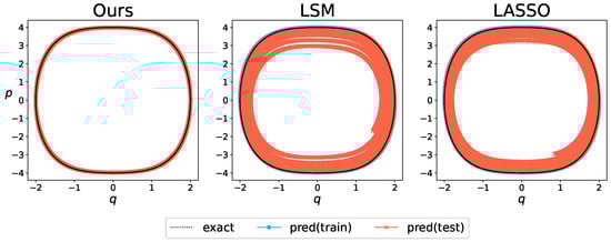 To demonstrate the effectiveness of the proposed method, we employed the least-squares method without regularization (LSM) and the least-squares method with -norm regularization (LASSO) for comparison. LSM and LASSO do not consider Hamiltonian mechanics and use the time derivatives of the state variables as objective variables. The evaluation criteria comprise assessing the accuracy of the estimated weight coefficients and comparing the accuracy of the long-term forecasts. For the long-term forecasts, nonlinear behavior was reconstructed from the estimated coefficients and basis functions to obtain the predicted values. The predicted values were obtained through numerical analysis, and their discrepancies with the true values were examined. In this case, the Dormand–Prince method implemented in SciPy [], a Python library, was used for numerical analysis. For numerical analysis, the tolerance for absolute and relative errors was set to be . During learning, it is assumed that a set of candidate functions containing the correct basis functions is prepared based on prior knowledge. In the proposed method, numerical partial differentiation by central differencing was employed in the operations regarding the basis functions of the proposed method. To achieve optimal sparsity, the regularization parameters were automatically selected to achieve the best generalization performance of the proposed method and LASSO.