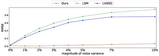 The comparison results of the trends of noise magnitude and the RMSE for each method are shown in Figure 7. The results for the proposed method are shown as red circles and solid lines, those for LSM as green crosses and dotted lines, and those for LASSO as blue triangles and dashed lines. LSM yielded accurate results in the absence of noise but yielded large errors with small amounts of noise and significantly larger errors as the noise level increased. LASSO showed a smaller error than LSM but similarly yielded larger errors with increasing noise. Meanwhile, the proposed method maintained an error of <0.1, even as the noise level increased; the error tended to increase only slightly. Even for 1% noise, the RMSE values of the conventional methods were large, whereas the proposed method showed a small RMSE value, even for 10% noise. This indicates that the proposed method is highly robust against noise.