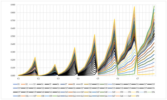 The next step entails the creation of 70 new IFRN SWARA-IFRN WASPAS models by implementing new simulated criteria values in each scenario. The results of changing the criteria values are given in Figure 2.