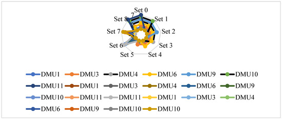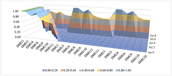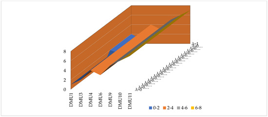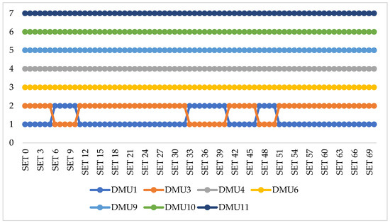 The ranks obtained through the 70 scenarios show the stability of the model and confirm the initial results, regardless of the change to the best alternative. In general, as previously noted, DMU1 and DMU3 represent road sections that are almost identical in terms of final efficiency. Therefore, it is not surprising that they exchanged their positions in certain scenarios, primarily due to the drastic drop in the value of the first, fourth, and fifth criteria. There were a total of 17 such cases, which is 24.29%.