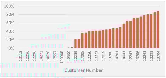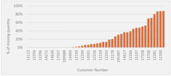 What can be observed is that of the 41 customers for which the company is responsible for transport, only 14 (around 34%) shipped with fully complete pallets. In other words, in terms of costs, if the pallets were sent at full capacity, the company would obtain savings of around EUR 47 thousand during the period in which the study was carried out. Extrapolating to annual values, the savings would reach EUR 338 thousand. Figure 4 illustrates the missing quantity in shipments to the customer, which, in the period, 4,855,094 units remained to be sent. Thus, it appears that 30% of customers receive pallets with less than 50% of the components they were supposed to receive, and 10% of customers receive pallets with a missing quantity percentage greater than 80%. Therefore, an intervention was necessary to improve this process through the optimization of pallets.