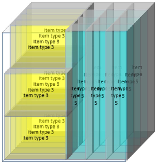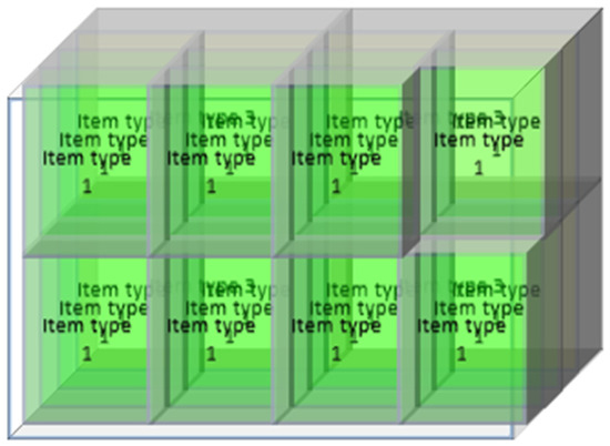 Figure 5, Figure 6, Figure 7 and Figure 8 show the distribution of packages in all configurations determined by the “CLP Spreadsheet Solver” tool. Figure 5 illustrates the distribution of packages on the type 1 pallet, which is only used once, whereas Figure 6 shows the distribution of packages on the type 2 pallet, whereby this configuration is used twice and designated as configuration 1. In turn, Figure 7 shows the distribution of packages on the type 2 pallet designated as configuration 2, and Figure 8 illustrates configuration 3 of the type 2 pallet. Therefore, to optimize the problem, in relation to customer 14701, five pallets must be sent weekly, corresponding to their needs. Thus, the software counts the packages that need to be sent, which means that the volume of packages on a pallet is maximized, thus minimizing the number of pallets needed for shipping.