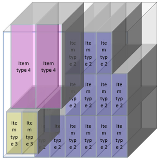 Therefore, the restriction in Equation (10) prevents packages from overlapping on the pallet, and the restrictions in Equation (11) prevent the number of packages of each type within the pallet from being lower or higher than the stipulated values. In turn, the restrictions imposed in Equation (12) guarantee the proportion of packages according to the ratio of each customer, and define the domain of the decision variables.