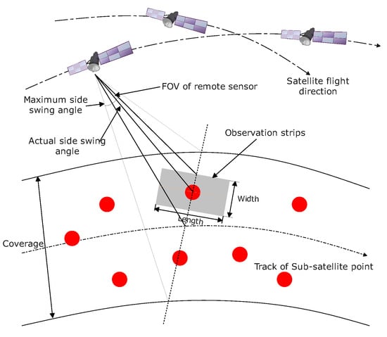 In this paper, we adopt the classical Earth observation system model, as shown in Figure 1. The Earth observation satellite orbits the Earth at a particular inclination turns on the onboard remote sensor payload when it flies over the ground target, and performs the observation operation by pushing and sweeping the image. The satellite observation area corresponds to an observation strip on the Earth’s surface parallel to the satellite’s subsatellite trajectory, and the missions within the coverage of the observation strip are considered to be observed. The satellite performs the observation by turning the side-swing angle of the remote sensor in the direction of the perpendicular satellite orbit to deviate the observation strip from the satellite subsatellite trajectory to cover more missions.