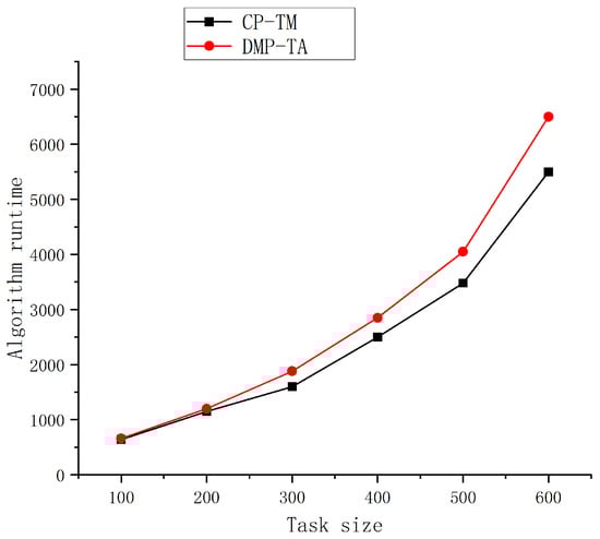 Figure 4 indicates that the execution time of the DMP-TA and CP-TM algorithms increases with the increase of task size. The execution time of the DMP-TA algorithm is slightly higher than that of the CP-TM algorithm for the same task size, and the difference in the execution time of the algorithms increases with the increase of the task size. This phenomenon is because the merging priority used by the DMP-TA algorithm in considering task merging needs to calculate the minimum energy consumption of the aggregated tasks, and this part of the calculation consumes some time. However, from the proof in Section 4.2, the time complexity of the DMP-TA algorithm is the same as that of the CP-TM algorithm, so it can be theoretically speculated that the difference in execution time between the DMP-TA algorithm and the CP-TM algorithm will not be significant regardless of the increase in task size.