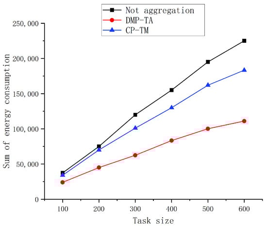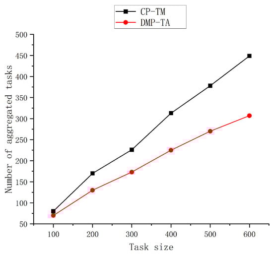 In this section, the effectiveness of the algorithm is first verified. In the above experimental scenario, six sets of experiments are set up, each with task sizes of 100, 200, 300, 400, 500, and 600, and the tasks are distributed in a mixed distribution. In the experiments, the running time of the DMP-TA algorithm, the number of aggregated tasks obtained after aggregation, and the sum of the energy required to perform the aggregated tasks after aggregation is verified. The sum of the energy consumption for the execution of the aggregated tasks solved by the algorithm is compared with the sum of the energy consumption for the performance of the tasks without aggregation and the sum of the energy consumption for the execution of the aggregated tasks solved by the CP-TM algorithm. To improve the reliability of the results, the two algorithms were run 15 times, and the average of the relevant results was taken. The obtained experimental results are shown in Figure 4, Figure 5 and Figure 6.