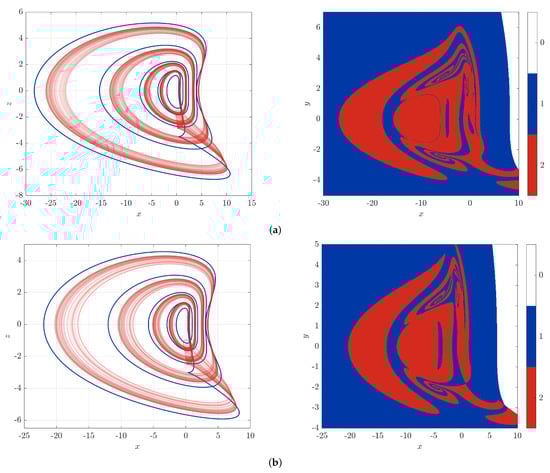 Basin of attraction and phase portrait for system (9). Red and blue colors correspond to two attractors, while the white color corresponds to the unbound solution; (a) and , ; (b) and , .