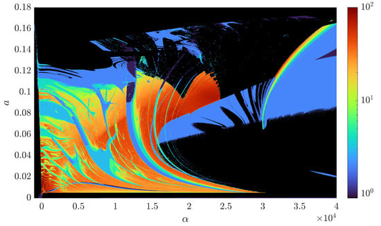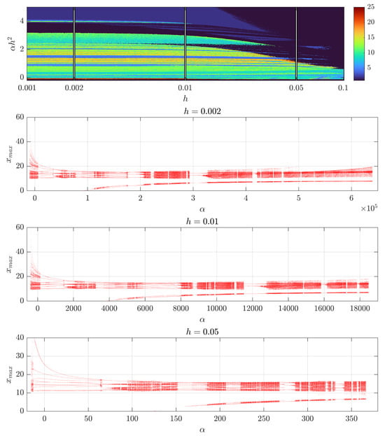 Let us plot the bifurcation diagram of the considered system using the alpha parameter (see the bottom plot in Figure 3). One can see that the system exhibits stable chaotic and periodic oscillations even beyond the ranges of . The 2D bifurcation diagram shows how the dynamics of the system (8) depend on the integration step h and the value of . However, a simple plot of will not clearly show all changes in the dynamics since the value is multiplied by the integration step and thus will violate the scale because the range of the values increases with the decrease in the integration step. Considering this, we used a technique similar to the method proposed in [18] for plotting two-dimensional diagrams as follows: for each integration step value, the range of the midpoint value is calculated according to the formula: