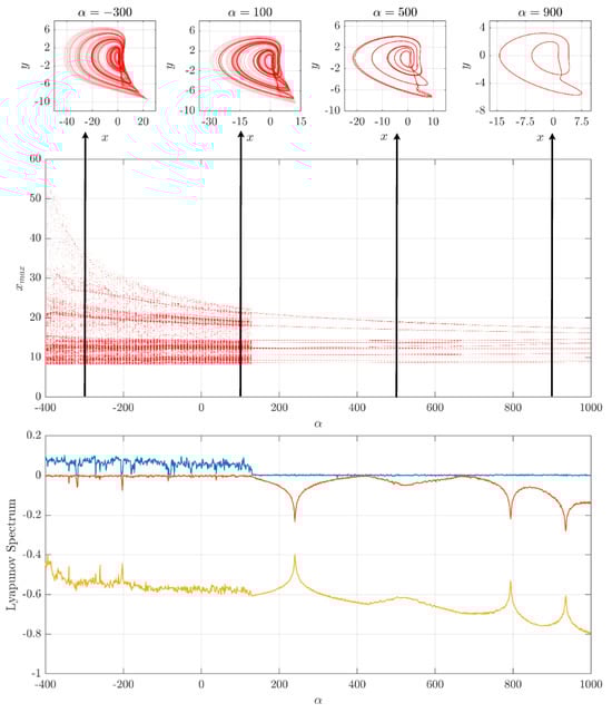 Bifurcation diagram and Lyapunov spectrum with respect to . The phase portraits for different values of are shown above.