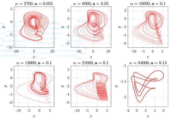 Figure 5 shows a 2D bifurcation diagram with varying parameters a and . The bifurcation diagram indicates the presence of both chaotic and periodic behavior. Additionally, Figure 6 presents phase portraits for various values of and a.