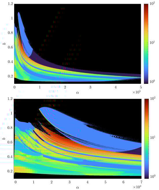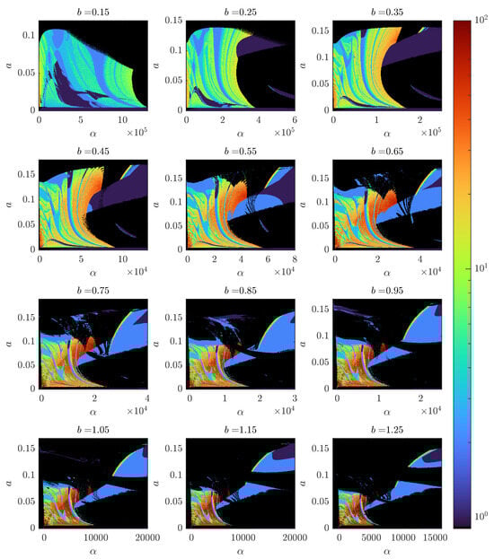 Figure 8 displays 2D bifurcation diagrams for different values of b for and parameter a. It is evident that as the parameter b increases, the range of values decreases.