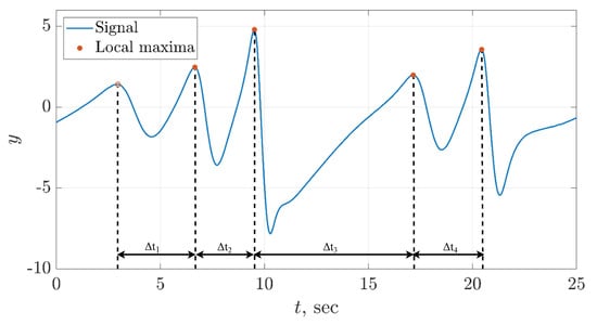 This subsection describes the evaluation of the secrecy of the designed chaotic communication system using specialized analysis methods and software. The underlying algorithm is a further development of the well-known return map analysis method. Let us apply the QRMA method that was described in [43]. To evaluate the secrecy of transmission using this method, one should find the values of the local maxima of the signal amplitude and determine the intervals between them. One point on the desired return map can be obtained by using a pair of values: the value of the maxima and the interval between the two peaks. The first maximum is omitted. Figure 13 displays the signal with the marked maxima.