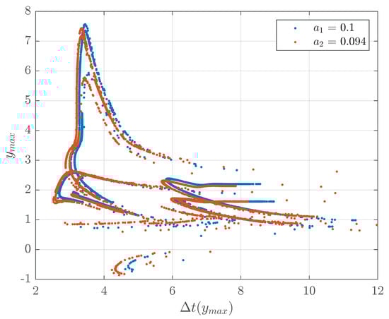 As one can see from (7), a variable does not present in the final series expansion and influences only the truncation error. Thus, it is generally valid to select the value of arbitrarily. Usually, it is supposed that , which corresponds well with the geometrical interpretation of the method. Nevertheless, it is not necessary to choose from this range to preserve the second order of accuracy. The dynamics exhibited by a discrete system at values beyond the range of are of particular interest. Interactions with the adaptive discrete operator can generate some nonlinear phenomena in the discrete model behavior that are not present in its continuous prototype. For example, in [18], the authors described the possibility of inducing artificial multistability in a discrete Chen system using composition diagonally implicit integration methods with controllable symmetry. Therefore, the hypothesis of the current study is that changing the parameter can lead to similar changes in system dynamics.