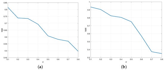 Figure 2 shows the variation trend of the corresponding NMI value with µ in the cases of three-layer, four-layer, and five-layer generation networks. In all three cases, the NMI values decrease significantly with the increase in µ value. This shows that the effect of the mixing parameter µ on the experimental results is independent of the number of layers in the generated network. The smaller the mixing parameter, the more obvious the community division in the generating network. Therefore, the model can detect the generated network with small mixing parameters better.