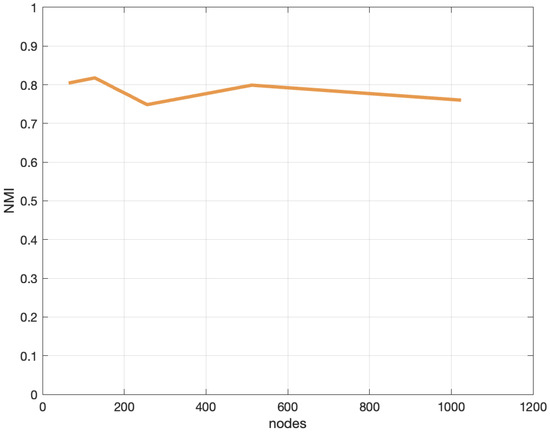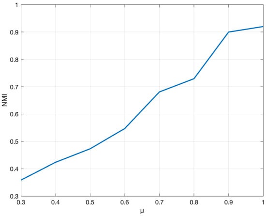 In order to investigate the impact of the interlayer dependency tensor on the detection outcomes, the number of produced network layers is kept at two. Then, the mixing parameter µ is set to 0.1, and the number of nodes is set to 64. The interlayer dependence tensor gradually increases from 0.3 to 1. The variation trend of the NMI value can be clearly seen in Figure 3.