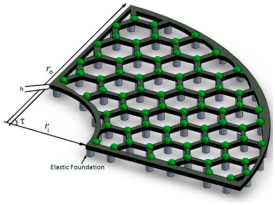 Figure 1 shows the graphene sector plate on the elastic foundation, considering ri and ro as the internal and outer radii, respectively. Additionally, the angle of the sector and the thickness of the plate are defined by and .