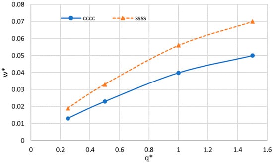 Figure 4 depicts the changes in dimensionless deflection versus bending loads. It is noted that by increasing the deflection, the deflection increases. Moreover, the difference in results between simply supporting boundary conditions and clamped conditions is more significant with the enhancement of the loads.