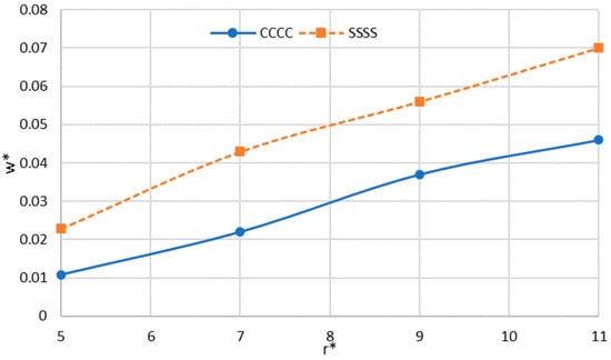 Figure 5 illustrates the changes in dimensionless deflection in terms of nondimensional radius for different boundary conditions. As can be seen, increasing the radius results in an enhancement of the deflection. Furthermore, increasing the radius causes a greater difference between the results of deflection in clamped and simply supported boundary conditions.