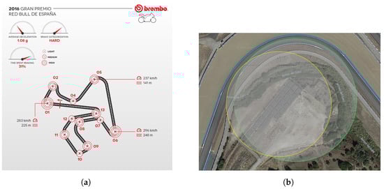 Jerez racetrack. (a) Jerez racetrack braking points; (b) The turn 8 at the Jerez racetrack. The radius of the green circle is 85 m, the radius of the yellow circle is 65 m.