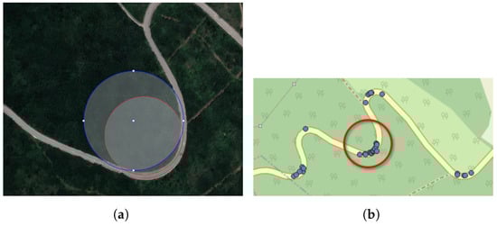 Bajna–Hereg multi-radius road. (a) The radius of the blue circle is 78 m, the radius of the red circle is 60 m; (b) Locations of accidents.