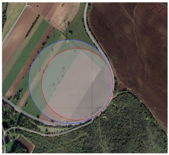 On the road leading to the town of Bajna, there is also a multi-inflection-point curve where accidents occur, but significantly fewer than on the curve between Bajna and Héreg; this is visible (Figure 5 and Figure 6) due to the fact that the diameters of the two circles that form the curve are considerably larger. The blue circle has a diameter of approximately 178 m, and the red circle is about 152 m in diameter (Figure 7).