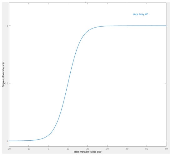 Based on the above data, two types of fuzzy membership functions can be defined: “easy” and “difficult” slopes. However, the “difficult” fuzzy set can be better described by a sigmoid (Figure 8) membership function than a trapezoidal (Equation (2)) one. The reason is that, beyond a specific value, the result is always “difficult”, unlike the “easy” fuzzy set, which is well expressed by a trapezoidal membership function.