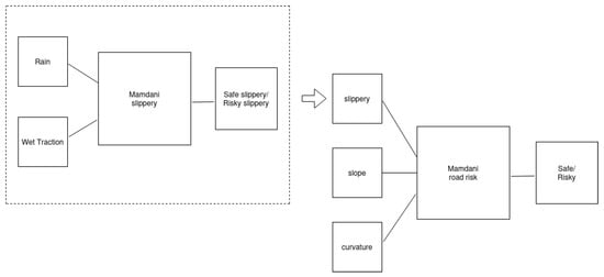 The road factors discussed in this article, such as the curve, slope, and slipperiness, can be included in a fuzzy model, as illustrated in Figure 9. Of course, the fuzzification of input values can be fine-tuned based on accident statistics reported by the country and region [].
