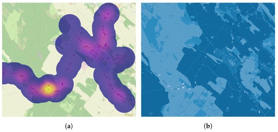 As mentioned in Section 4, Aslam Al-Omari et al. [] compared the results of the fuzzy-based (FOM) method with the Weighted Overlay Method (WOM) in the analysis of hazardous road sections. Since these methods produce visually evident results, it is interesting to compare the results of the fuzzy model with heatmap and WOM analyses.
