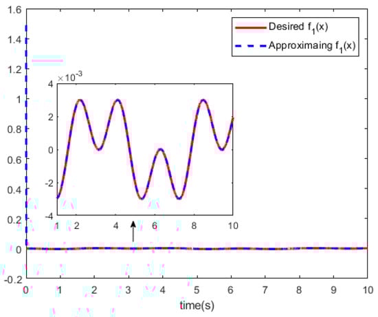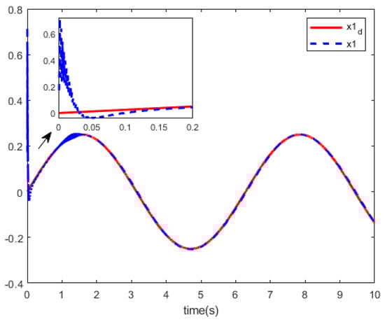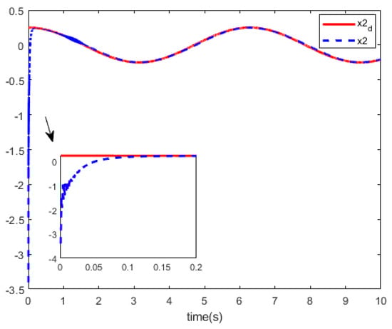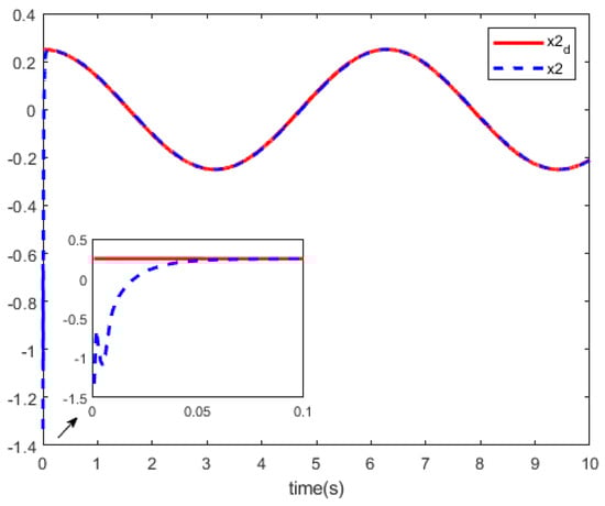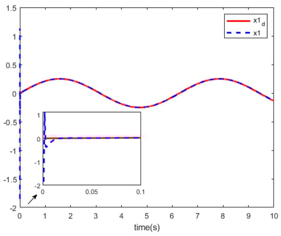 For the actor network and the critic network, we also use the same parameter settings. A 2–15–2 structure is chosen for the critic networks and actor networks, the initial weights are randomly chosen between , and the learning rate is 0.1. The hidden layer uses the function and the function , and the output layer uses the function . Then, the given accuracy is . In Figure 7 and Figure 8, we can see the curves of the state trajectory x and the reference trajectory using tracking control methods for references.