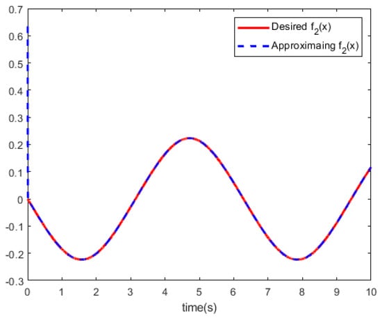 Firstly, in order to deal with the unknown dynamics, we need to use two RBF networks to obtain the RBF identifier and the RBF steady-state controller. The RBF networks have a three-layer structure with two input neurons, hidden layers have nine neurons, and output layer have two neurons. The parameters and of the radial basis functions are chosen to be and , and the initial weights are chosen to be random numbers between . For the RBF identifier with its weights updating law (21) to update the weights , the unknown function f is identified by the input/output data . For the RBF steady-state controller, the reference trajectory data and the weights updating law (28) are used to update the weights to identify the steady-state controller . Because , we can select . According to of Theorem 1, we can select . For the control parameters , because hidden layers have nine neurons, , , we select . With control parameters , we can know and from Theorem 1 and thus select . The initial state is set as . We trained the RBF networks with 10,000 steps of acquired data. Figure 2 and Figure 3 show the RBF-NN identifiers to approximate the tracking curves of the unknown dynamics .