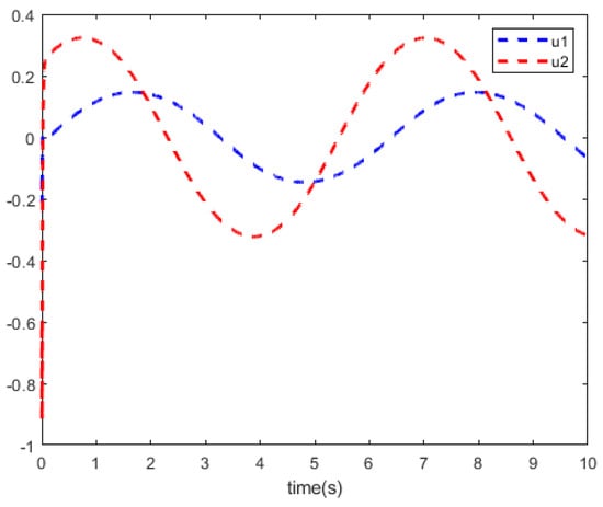 Then, based on the ADP algorithm of Bellman optimality, Equation (6) was used to obtain the tracking error e and the optimal feedback control to train the critic network and the actor network, respectively. Meanwhile, the obtained standard control inputs were used in system (1), which keeps on looping until the value function converge and the tracking error is zero, where the performance index is selected as and , where I is the identity matrix with appropriate dimension. For the actor network and the critic network, we used the same parameter settings. The initial weights of the critic networks and actor networks are randomly chosen between . The input layer has 2 neurons, the hidden layer has 15 neurons, the output layer has 2 neurons, and the learning rate is 0.1. The hidden layer uses the function and the function , and the output layer uses the function . Though parameter settings, we trained the actor network and the critic network with 5000 training steps to reach the given accuracy . Figure 4 shows the curves of the system control . In Figure 5 and Figure 6, we can see the curves of the state trajectory x and the reference trajectory .
