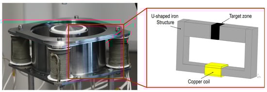 In this paper, we focus on the optimization of a magnetic circuit similar to that of a Hall-effect thruster, as represented in Figure 1. It should be noted that the “toy” problem presented in this study is not intended to be fully representative of the real world, but rather is intended to allow a 3D magnetostatic problem to be considered without oversimplification.