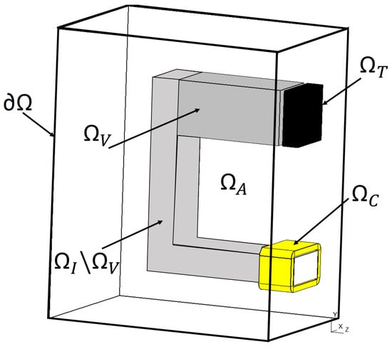The magnetic circuit consists of a copper coil enclosing a U-shaped iron structure surrounded by air. From a numerical point of view, the air is represented by a cube of finite size whose walls are sufficiently far from the structure so that they do not influence the simulation results. The full simulation domain is denoted by , the coil by , and the iron parts by . The air regions are then given by ; see Figure 2.